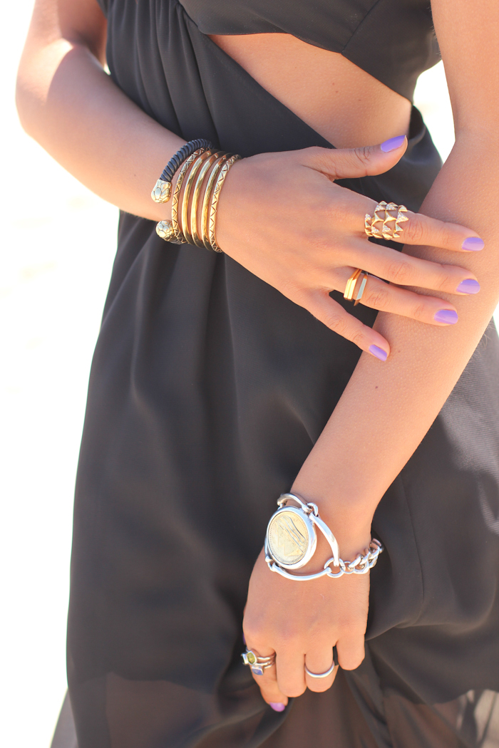 Black chiffon maxi dress with side cutouts via Flirtcatalog | Going Platinum embellished flats via Caroline Cree | House of Harlow etched stack cuff & pyramid wrap ring, Low Luv horse bit and coin bracelet via Glamhouse | SEPHORA OPI nailpolish in "Iris I Was Thinner"