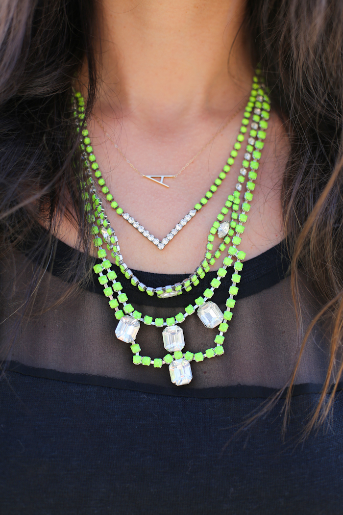 Leather skirt via Minusey | Hand painted neon yellow rhinestone necklace via LoveObsessed | Sandro Paris Tolerance knit shirt - similar here & here | Rebecca Minkoff eyelet mini sweetie bag | Tibi Amber high heel sandals - similar here & here