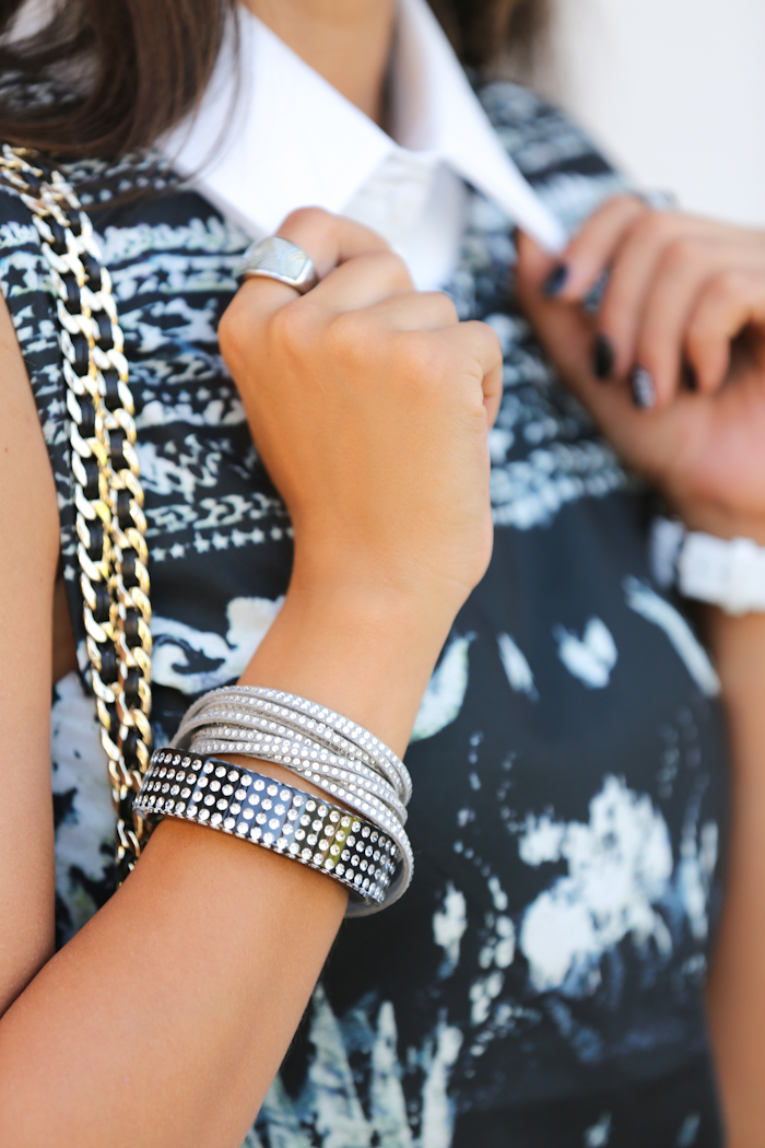 Sort of living a very surreal moment right now... I've always been a huge Swarovski fan, so when I was approached to help showcase some of the must-have pieces of the season, you can imagine I was beyond ecstatic:) For my look, I chose two elegant yet modern, Swarovski crystal encrusted bracelets, which in my opinion work equally well for day or night. To maximize the impact of the jewelry, I wanted to keep to a black and white color palette, adding just a bit of color drama with grayish-turquise print elements of the dress.