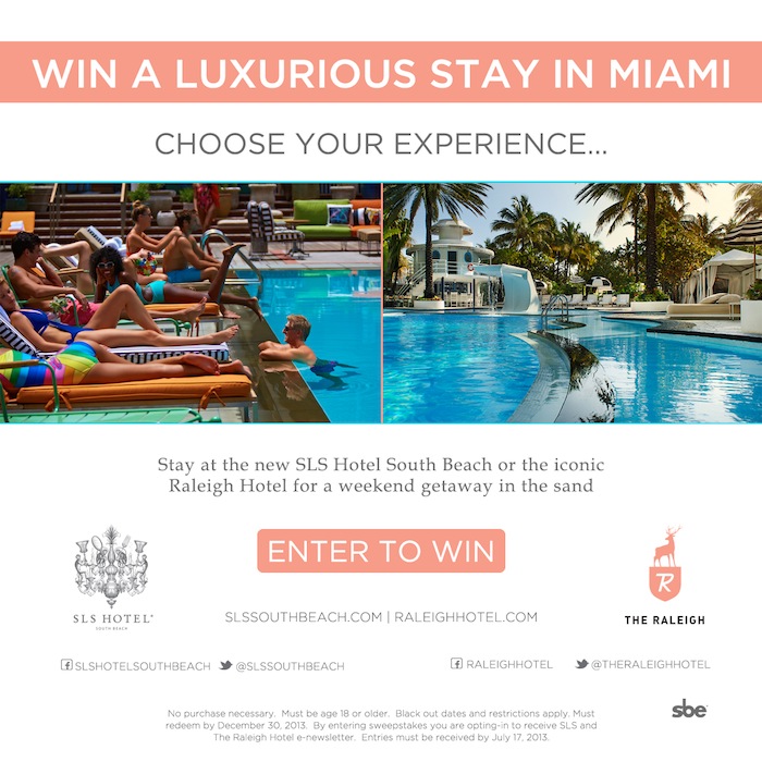 1 lucky reader + a friend will win a roundtrip flight to Miami as well as a 2-night stay at SLS Miami or Raleigh Hotel OR if you live in Miami, you have a chance to win 2 tickets to attend Swim Week with me! Simply CLICK HERE or on the image below to ENTER!
