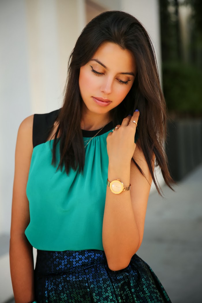 Normally, I don't get this dressed up for dinner, but since it was the first time wearing my new watch—and I love the combination of gold and green—I decided dinner was a good enough excuse to take this look out for a walk. You know me and how I feel about pretty new things—I just don't have the willpower to wait! How about you guys: do you wait for a special occasion or wear new stuff right away?