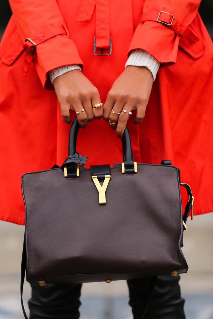 House of Harlow Chelsea sunglasses | Saint Laurent Classic Cabas Y-Ligne medium leather bag via Gasmy | Cole Haan trench coat - sold out { similar option here } | Current/Elliot ankle skinny leather pants { also here } | Valentino Punkouture rockstud pumps | Essie nail polish in "Clam Bake" | Wanderlust + Co double-bar & chain silver rings & multi stud gold cuff Orange trench coat