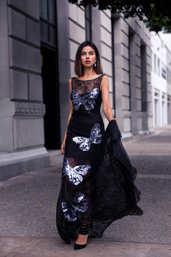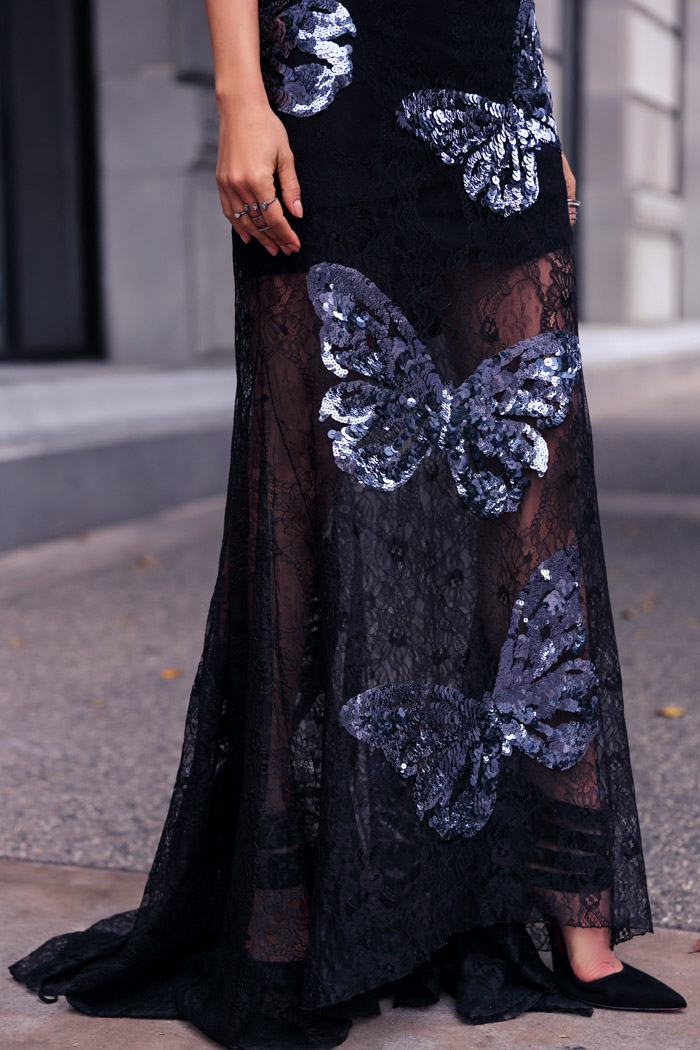 If you read my blog on regular basis, you may have noticed that lately, it's been all about floor-length gowns for me and the amazing, lace and sequined butterfly Via Della Perle number I am wearing in today's post is definitely one of my favorites so far. Couldn't decide what I love the most about it if I tried, but I have a feeling, it is the combination of elements rather than a particular detail. I think what attracted me to this dress in the first place was the beautiful gunmetal butterfly embroidery, but the open back combined with the sexy lace asymmetric hem made me fall in love!
