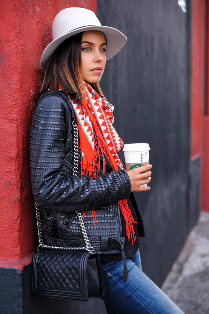 If I had to describe 3 items I cannot picture my wardrobe without, distressed jeans, leather jacket ( preferable studded and studded a lot ) and killer boots would be right at the top of that list. Though I certainly like to experiment with my style, because as we all know, trying something new feels refreshing, it's the combination of the three mentioned above, that makes me feel, well... like me the most. And of course, given mine, yours and everyone's propensity for wearing what we like over and over again, the jacket, jeans and boots combo is always in heavy rotation. Yet, as much as those three ingredients stay the same, what does change are the accessories.